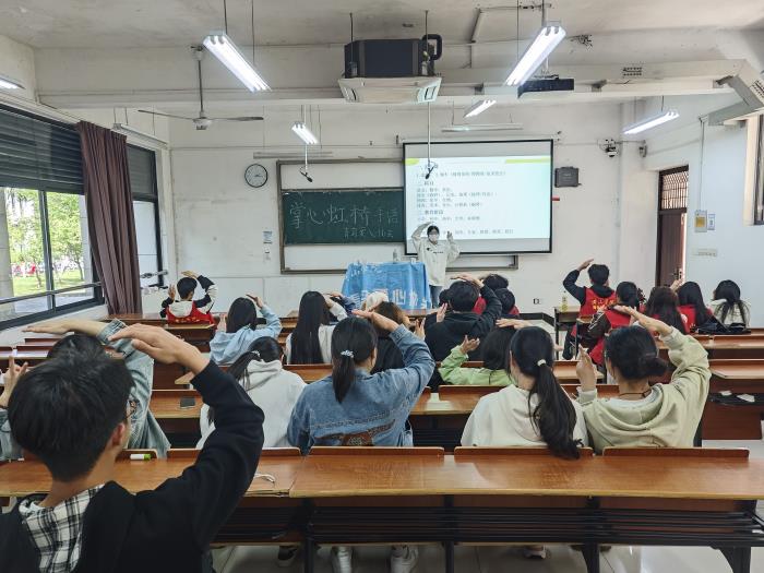 本次活动旨在通过学习交流手语,认识到手语作为一种交流方式的重要性和价值。活动现场,由一到两位工作人员上台依靠多媒体进行主讲,手把手教导同学们一些基本的手语动作,其余志愿者则在下方维持现场秩序和纠正同学们的动作,现场氛围欢乐且井然有序。