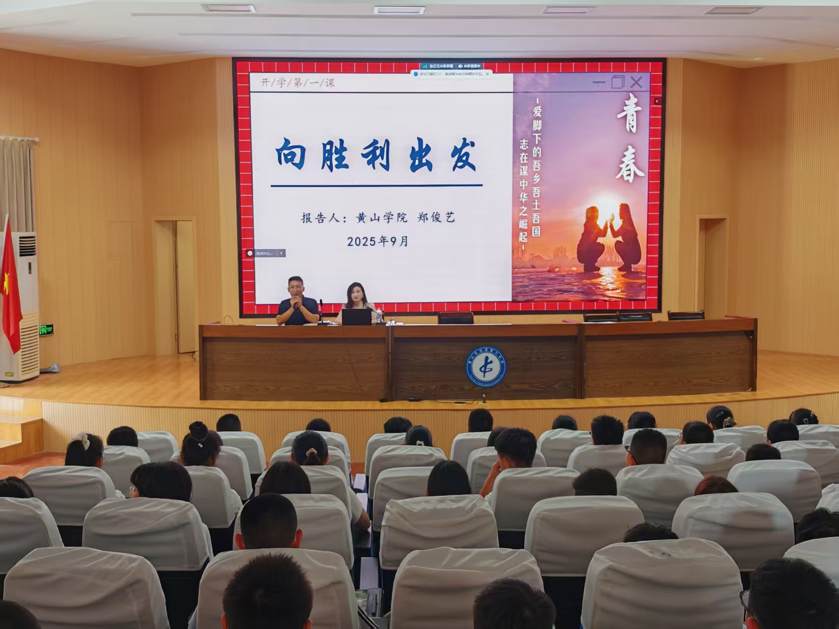 2025年9月1日,bat365正版唯一官网纲要课教研室主任郑俊艺走进屯溪六中,以“向胜利出发”为主题,为屯溪六中的师生带来一堂别开生面的“开学第一课”。此次活动是bat365正版唯一官网牵头建设的黄山市大中小学思政课一体化共同体的生动实践,也是bat365与中小学协同育人模式的创新探索。