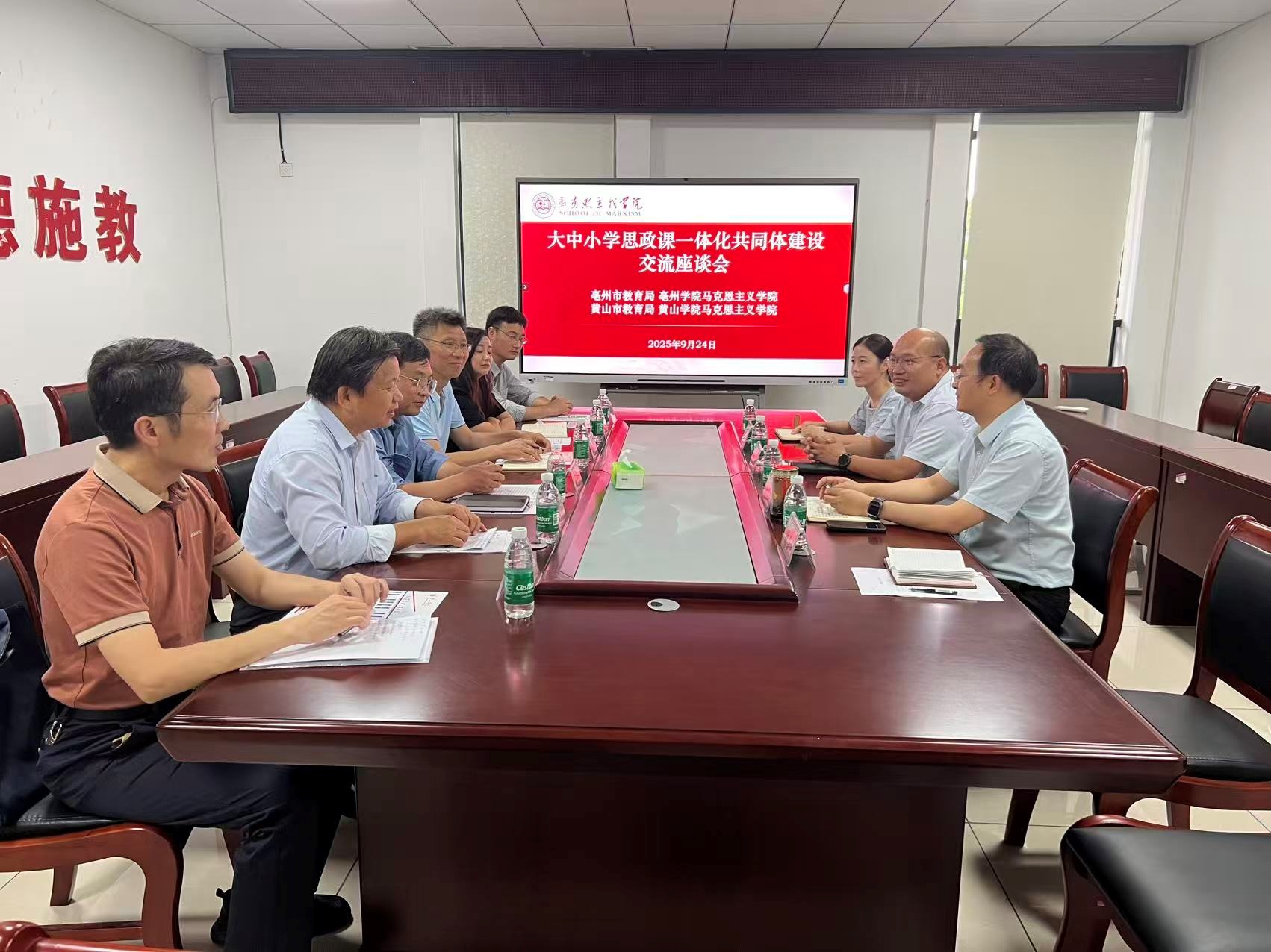 9月24日下午,亳州市教育局四级调研员、机关党委副书记杨超杰,亳州学院bat365正版唯一官网党总支书记王振华一行4人来bat365开展大中小学思政课一体化共同体建设交流座谈会。黄山市教育工委委员、市教育局副局长谢其正,市教科院政治教研员崔蓓莉、bat365院长刘芳正、党总支副书记(主持工作)廖荣军及教师代表参加会议。会议由谢其正主持。