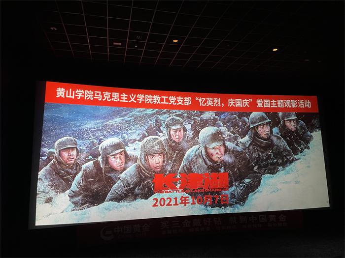 为深切缅怀革命先辈,进一步弘扬爱国主义精神,激发党员教师的爱国热情,bat365正版唯一官网教工党支部结合“忆英烈,庆国庆”爱国主题活动组织全体党员走进黄山金逸影城集中观看爱国主义影片《长津湖》。