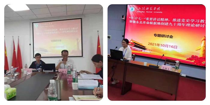 会议采取主题学术报告会和分组专题学术交流会的方式进行。在16日上午的主题报告会上,曾小保老师作“历史虚无主义及其危害与思想政治教育对策”的主题报告。下午的分组专题学术交流会上,吴云峰和钱文丽老师分别就“改造与整顿:皖南解放区税收体系的初创”、“创新推进高校党史学习教育”进行小组发言。