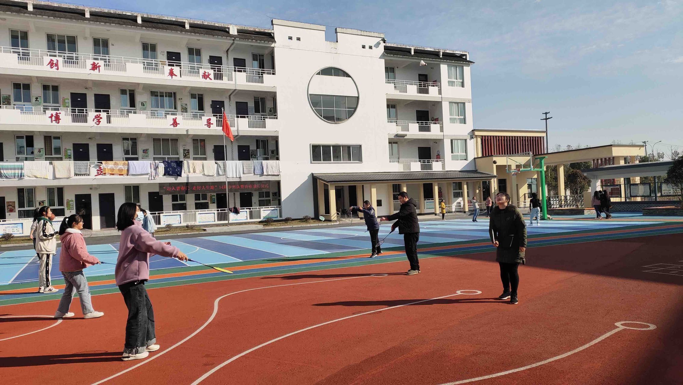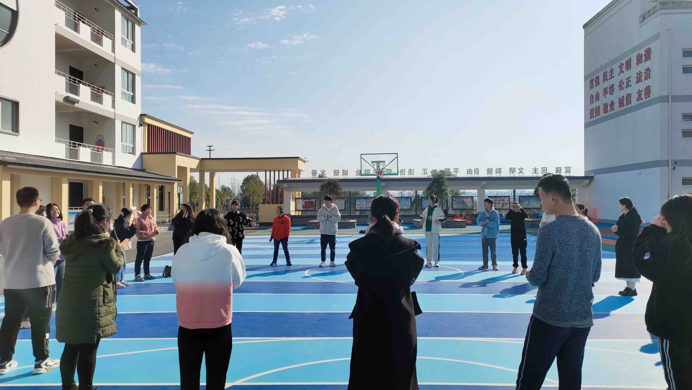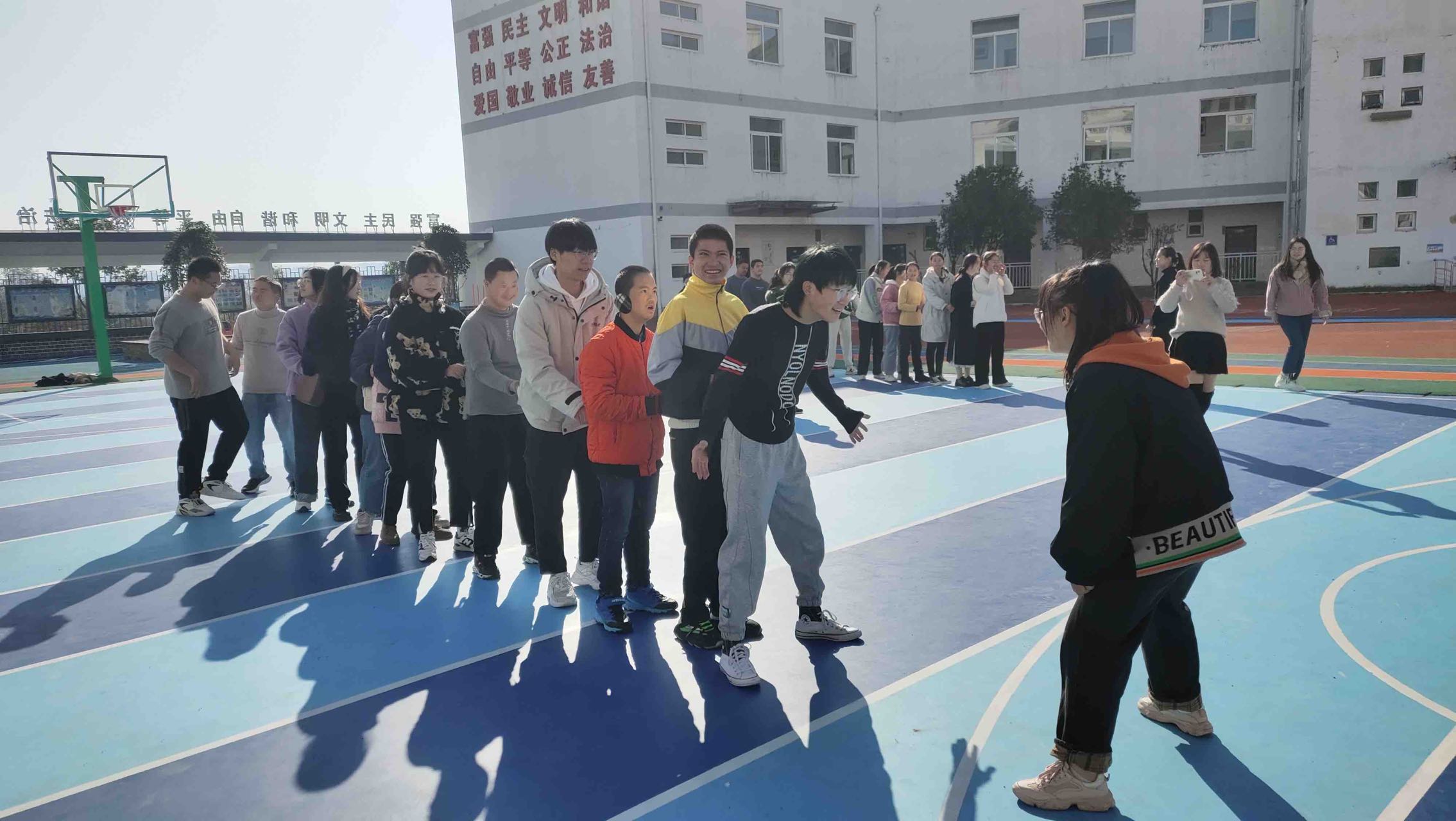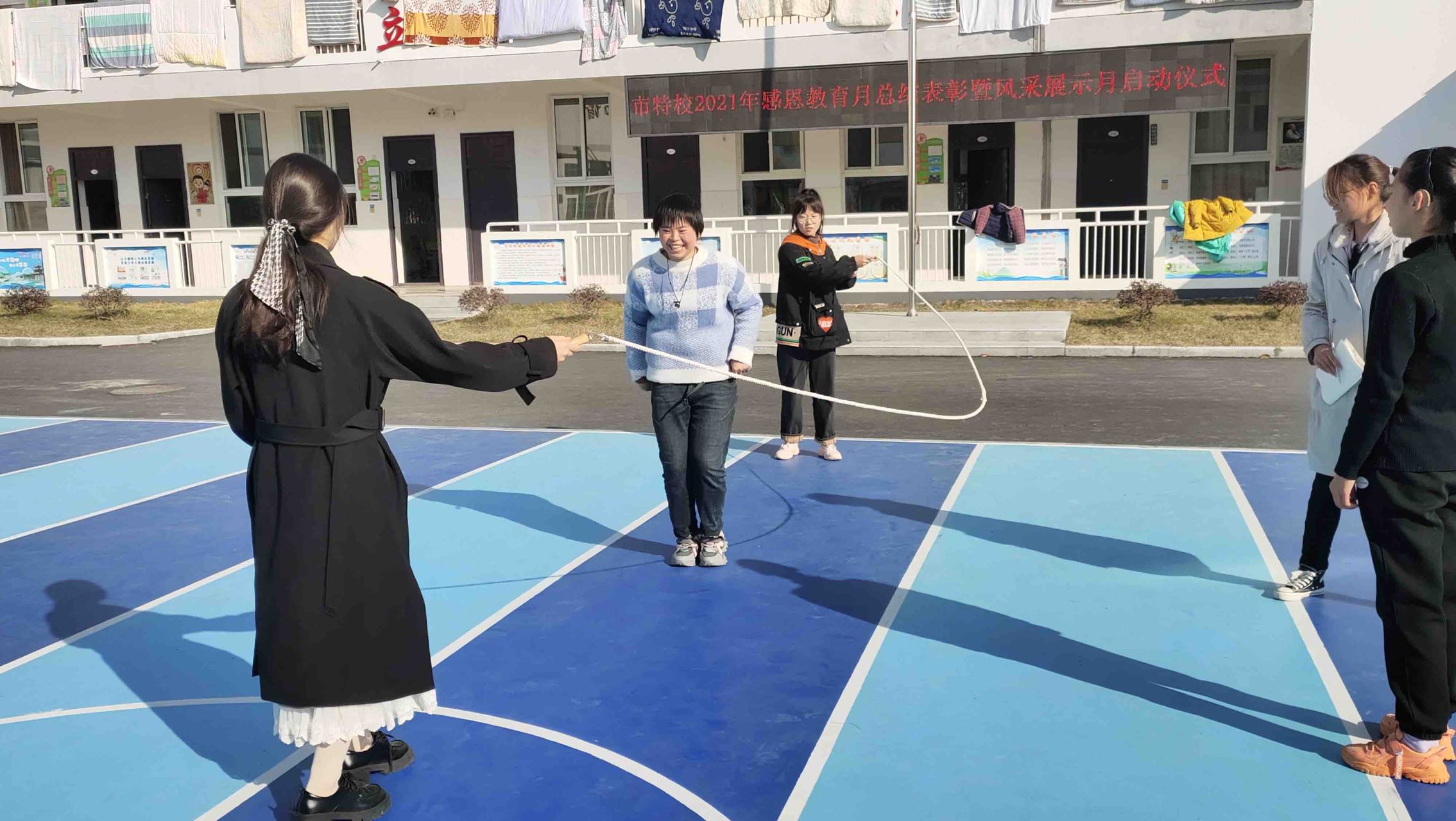 在操场的互动环节中,孩子们在特校老师的帮助下和志愿者们一起进行了“沙包投掷”、“打篮球”、“打羽毛球”“老鹰捉小鸡”“丢手绢”等游戏比赛活动。
