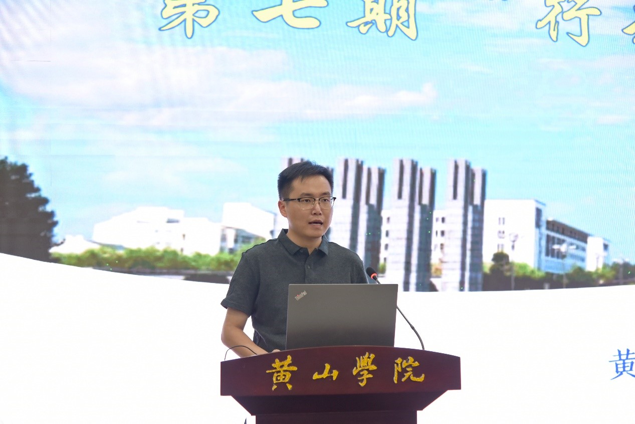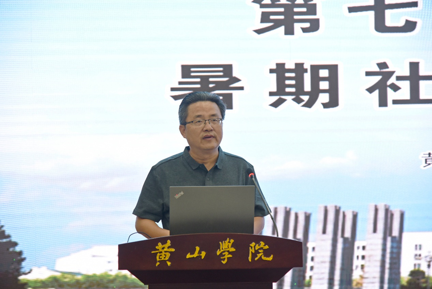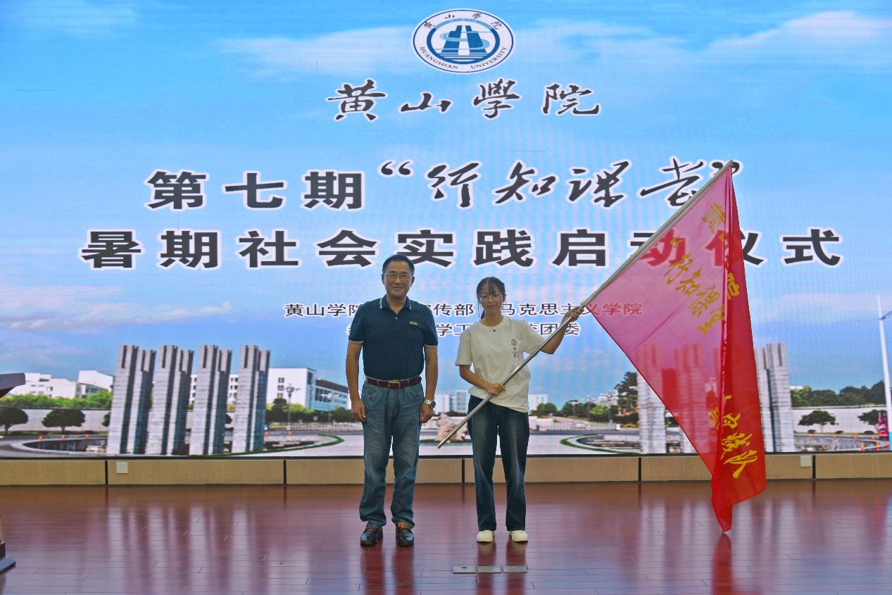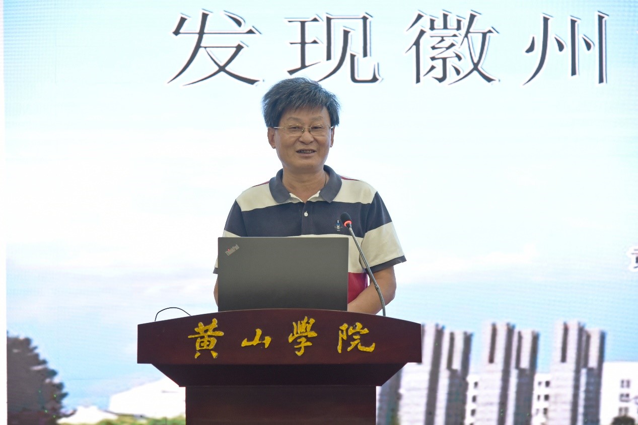 张赛为bat365正版唯一官网第七期“行知课堂”社会实践活动授旗。合影后,马勇虎教授为学员作“发现徽州故事,讲好徽州故事”的主题辅导报告。