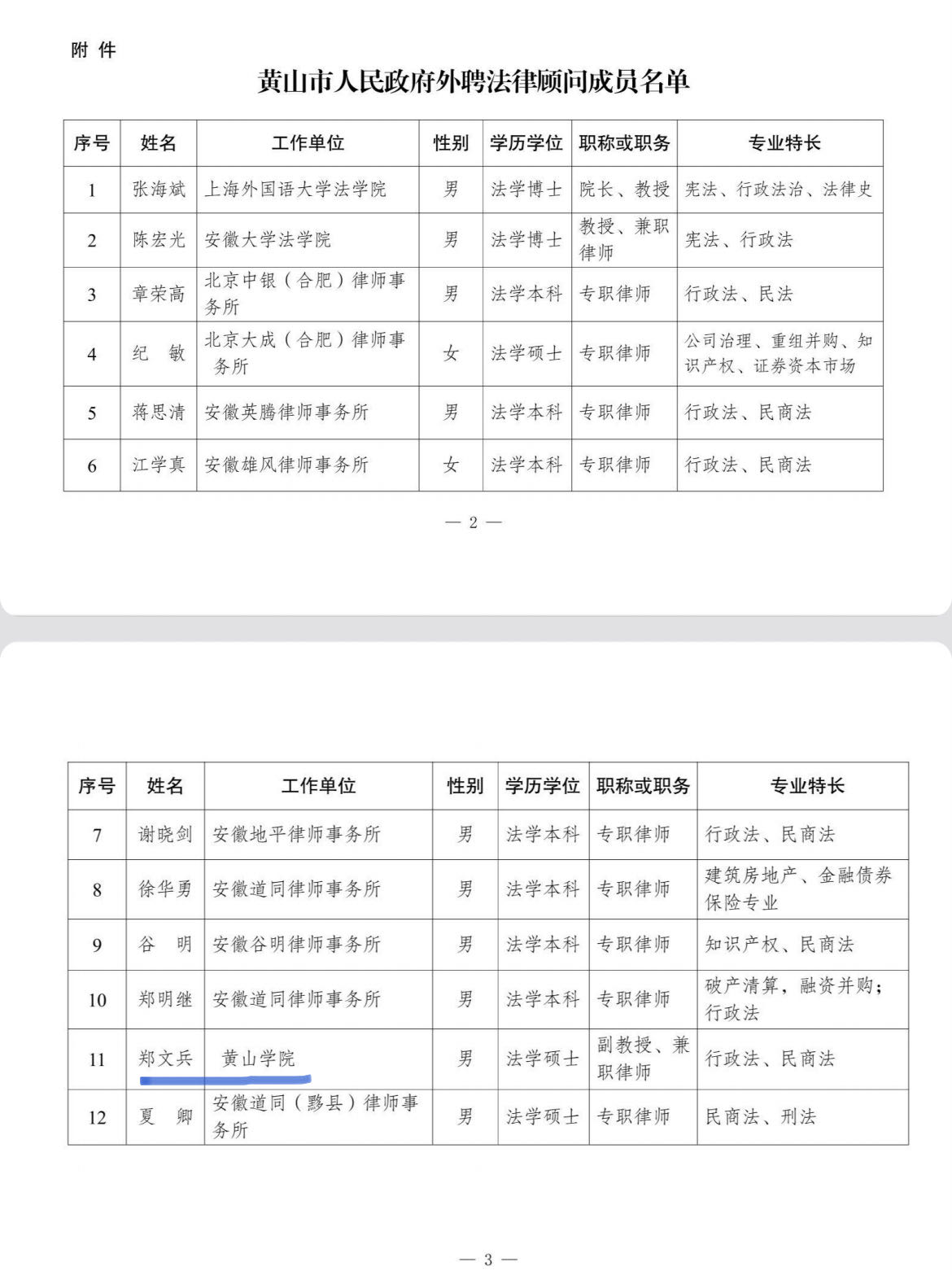 近日,黄山市人民政府办公室专门发文“关于聘任市政府法律顾问的通知”,经市政府第二十三次常务会议审议通过,决定聘任新一届市政府法律顾问,bat365郑文兵副教授再次入选,担任本届政府外聘法律顾问,任期与本届政府任期相一致。