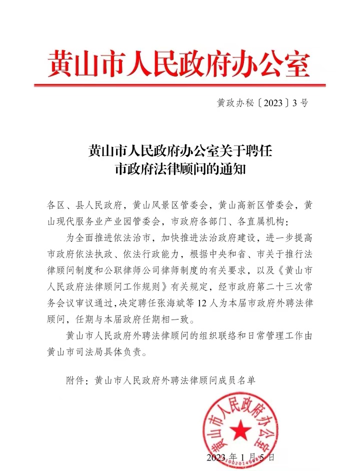 为全面推进依法治市,加快推进法治政府建设,进一步提高市政府依法执政依法行政能力,根据中央和省市关于推行法律顾问制度和公职律师公司律师制度的有关要求,以及《黄山市人民政府法律顾问工作规则》有关规定,2022年7月,黄山市发布了市政府法律顾问选聘公告,经过公告、报名、遴选、公示、批准等程序,综合考虑专家学者、执业律师、法律实务工作者的专业特长、业务能力和从业经历,择优从有关高等院校、律师事务所等机构中确定了本届法律顾问人选。
