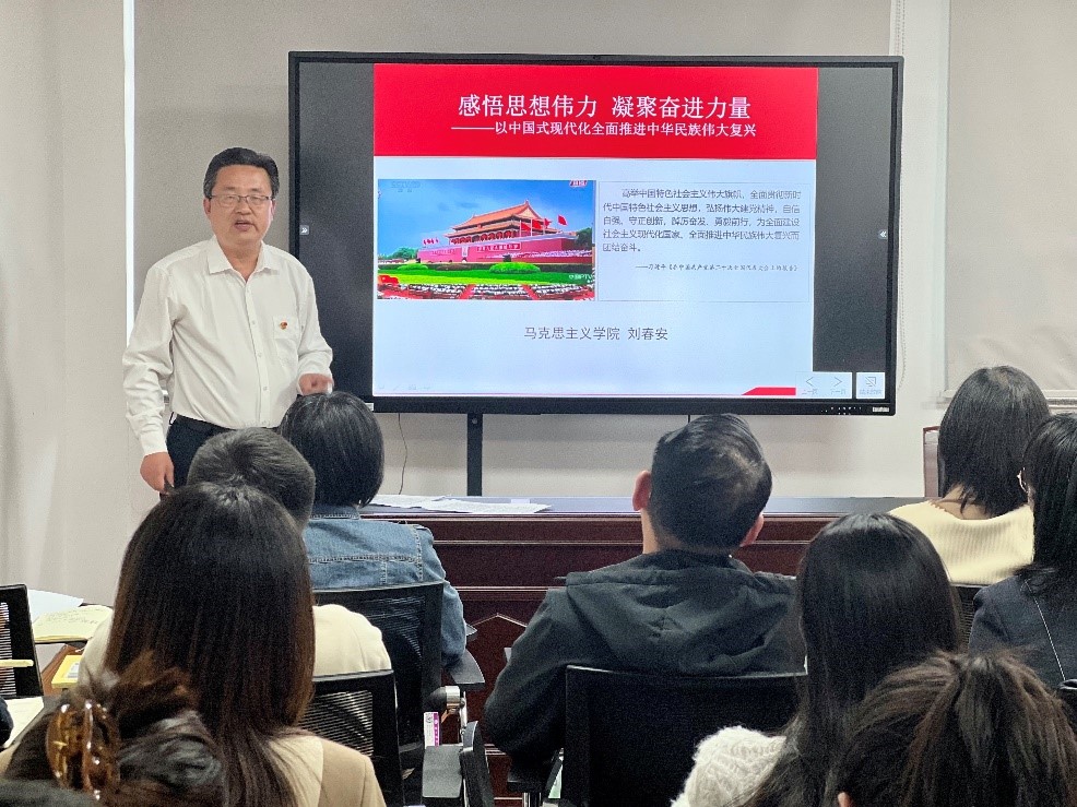 5月10日下午,bat365正版唯一官网在该院党员活动室开展学习贯彻习近平新时代中国特色社会主义思想主题教育专题党课。该院党总支书记刘春安作题为“感悟思想伟力 凝聚奋进力量”党课报告。该院全体教师参加党课学习。