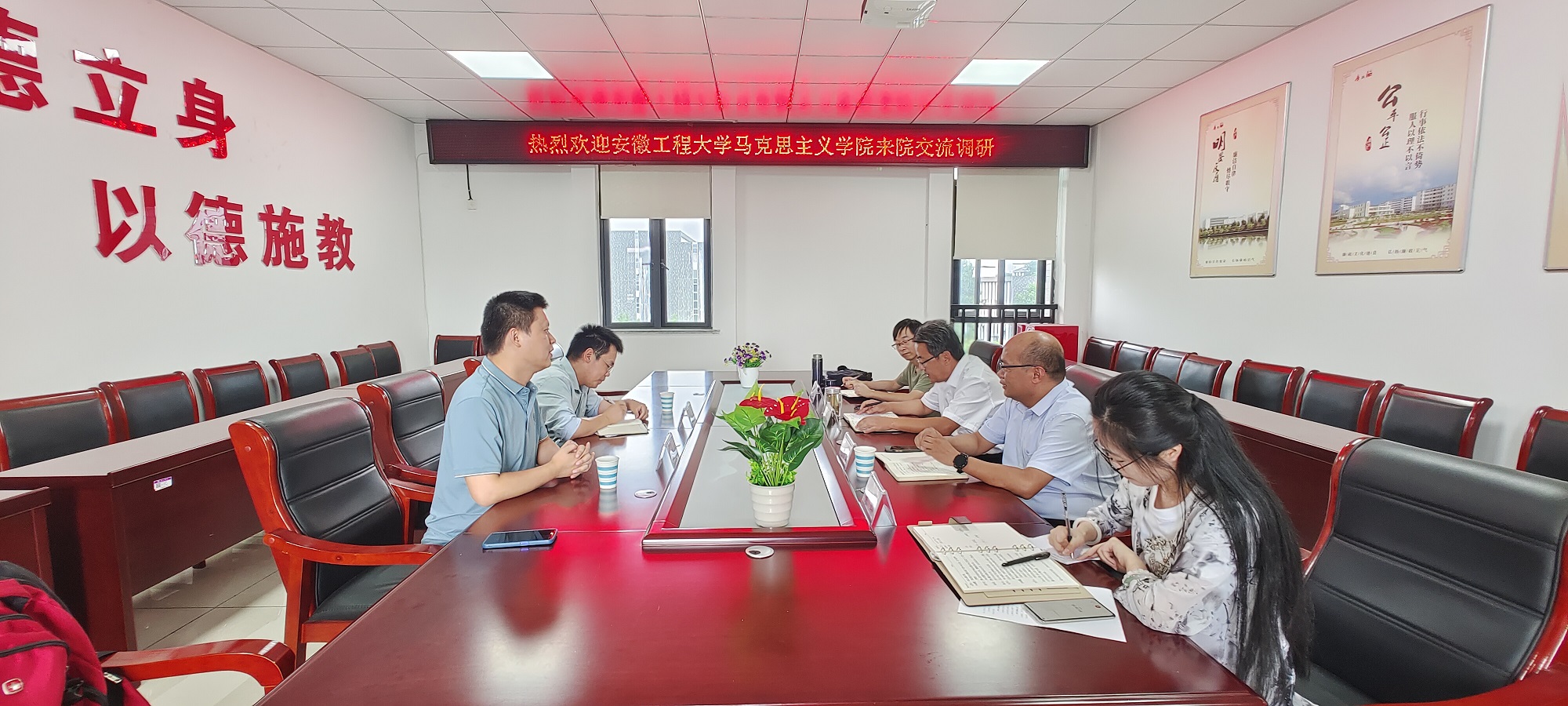 9月13日,安徽工程大学bat365正版唯一官网副院长李海涛一行来bat365,就马克思主义理论学科建设、“大思政课”建设等内容进行考察交流。bat365正版唯一官网党总支书记刘春安、副院长刘芳正、纲要教研室主任吴云峰等参加座谈。会议由刘春安主持。