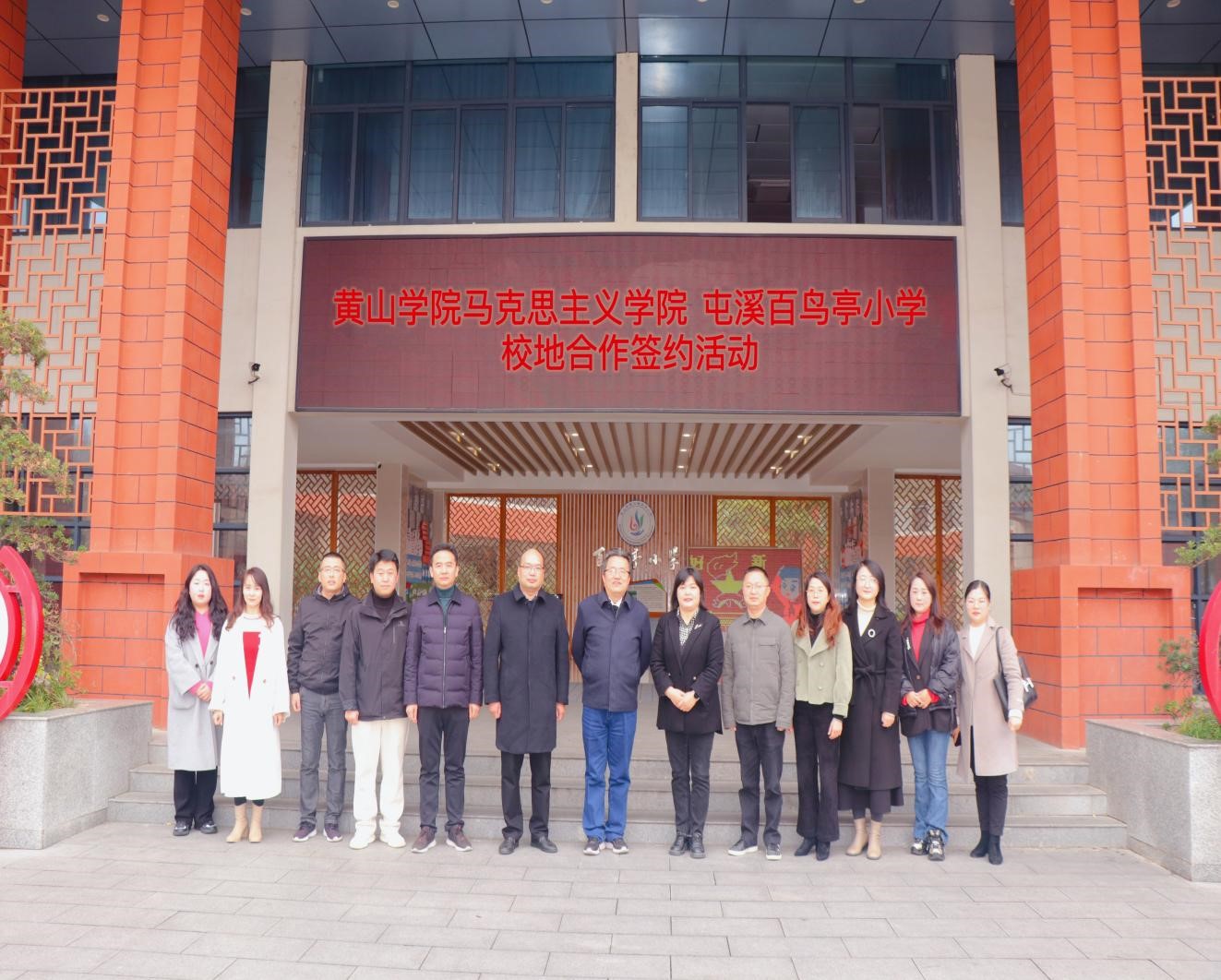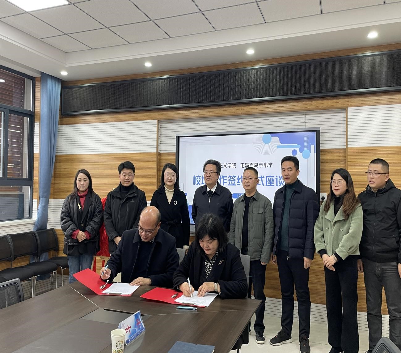 为积极推进大中小学思政课一体化建设,共建共绘“立德树人 铸魂育人”最大同心圆,12月4日上午,bat365正版唯一官网与与屯溪百鸟亭小学在百鸟亭小学会议室举行校地合作签约仪式。bat365正版唯一官网党总支书记刘春安、副院长(主持)刘芳正、教师代表郑文文、凌淑瑜、王凡,屯溪区委教育工委委员、屯溪百鸟亭小学教育集团总校长王千红,屯溪区教育局教研室负责人吴积良等参加了签约仪式,仪式由百鸟亭小学党支部副书记黄建辉主持。