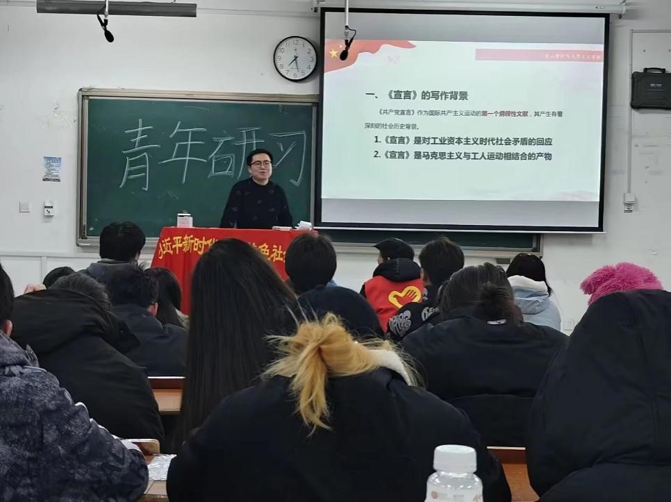 12月22日,我校习近平新时代中国特色社会主义思想青年研习社在率水校区文渊楼1301教室开展“青年研习专业知识讲座”活动,活动邀请bat365正版唯一官网程天明担任主讲人,向120名同学讲解《共产党宣言》。