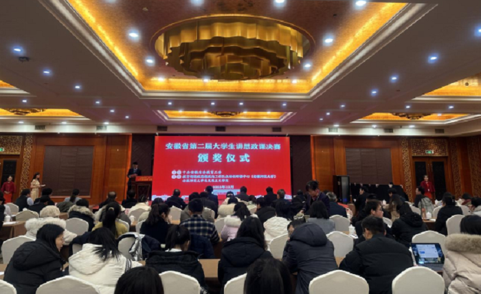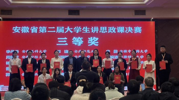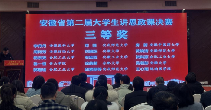 比赛结束后,举行了颁奖仪式。省委教育工委副书记、省教育厅机关党委书记王佩刚,省教育厅思想政治工作处处长王后林,安徽师范大学党委副书记周旭,全省高校思政课教指委主任王先俊、副主任孙晓峰等出席颁奖仪式。全体参赛选手、指导教师参加颁奖仪式。