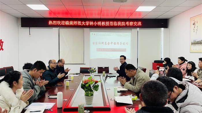 1月3日,教育部人文社科重点研究基地赣南师范大学中国共产党革命精神与文化资源研究中心执行主任钟小明教授、副主任彭景涛副教授、黄平森博士一行来bat365正版唯一官网考察交流。考察期间,钟小明教授为中青年教师作题为“国家社科基金申报指导”的主题报告。交流座谈会由bat365正版唯一官网副院长(主持)刘芳正主持。