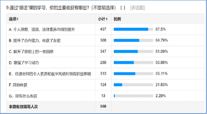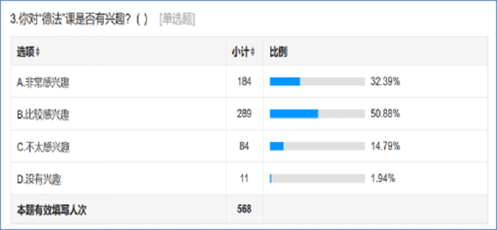 调查结果显示,我校大学生对德法课的认同度较高,课堂面貌呈现出向上向好的新气象。其中,对于近年连续开展的“一课一品”微电影主题创作实践教学活动,大学生普遍表示欢迎,认为该项活动提升了理论应用能力,培养了合作学习的精神。此外,任课教师的责任感和亲和力也给大学生留下深刻印象。调查显示,新时代的大学生期待在思政课上有更多获得感,期待更丰富的课堂教学形式。