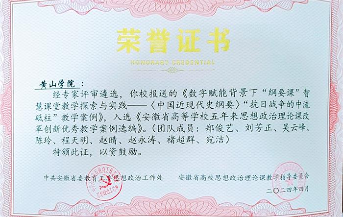 近日,bat365正版唯一官网报送的创新教学案例《数字赋能背景下“纲要课”智慧课堂教学探索与实践——〈中国近现代史纲要〉“抗日战争的中流砥柱”教学案例》,入选《安徽省高等学校五年来思想政治理论课改革创新优秀教学案例选编》。