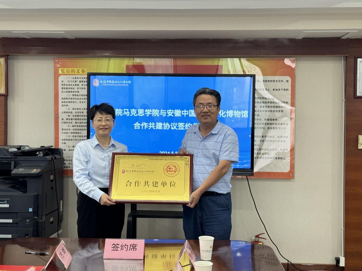 在双方代表的共同见证下,刘芳正和姚昱波签署“合作共建协议书”,刘春安和石嫱为“合作共建单位”揭牌。安徽中国徽州文化博物馆还向学院赠送了《安徽中国徽州文化博物馆藏文物精品集》等文献资料。