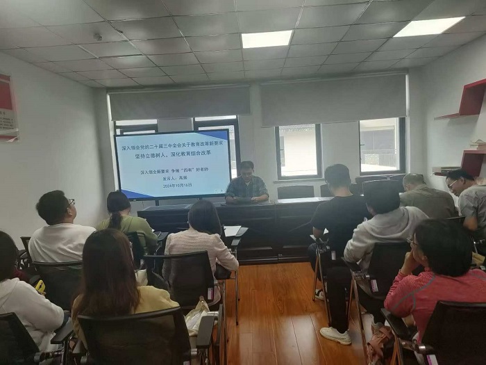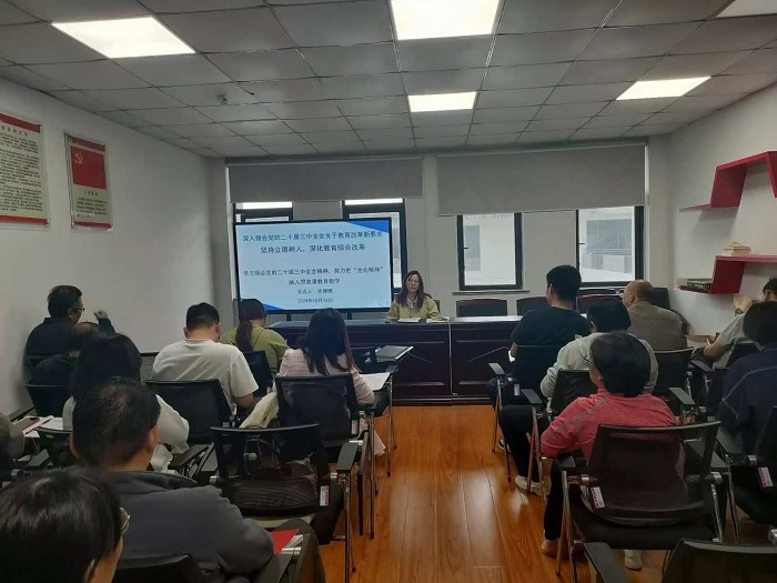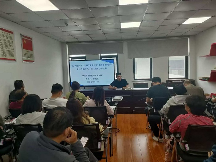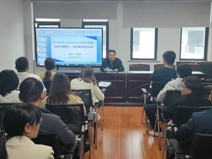 刘春安细致解读了党的二十届三中全会关于教育改革的新要求。他指出,立德树人是教育的根本任务,也是学院发展的核心目标。一方面全院教职工要深刻认识立德树人的重要性,将立德树人理念融入到教育教学、科研、学生服务等各项工作中。另一方面要通过加强思想政治教育、提升学生综合素质、培养创新精神和实践能力等措施,努力培养德智体美劳全面发展的高素质人才。最后,他要求全院教职工要深入领会全会精神,将全会关于教育改革的新要求与学院发展实际相结合,明确工作方向和目标,形成合力,共同推动学院教育教学高质量发展。