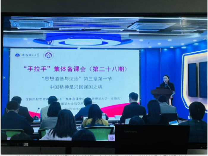 第一环节,集体观摩由安徽师范大学bat365正版唯一官网主办的“手拉手”集体备课会(第28期)线上直播活动。备课会上,来自安徽工程大学bat365正版唯一官网教师季雨亭、芜湖学院bat365正版唯一官网教师方宝华、安徽师范大学bat365正版唯一官网教师龚伟分别围绕“中国精神是兴国强国之魂”主题以“同课异构”方式先后进行“说课展示”。之后,三位专家对老师们的展示作出点评,安徽师范大学bat365正版唯一官网教授路丙辉作备课小结。本次集体备课活动在安徽师范大学bat365正版唯一官网举行,同步在教育部集体备课中心“云上大练兵”平台进行直播。
