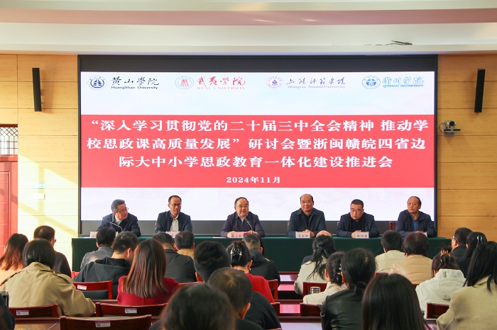 11月23日,“深入学习贯彻党的二十届三中全会精神 推动学校思政课高质量发展”研讨会暨浙闽赣皖四省边际大中小学思政教育一体化建设推进会在我校举办。bat365正版唯一官网党委委员、副院长张小明出席研讨会,bat365正版唯一官网党总支书记刘春安主持研讨会开幕式。四校bat365正版唯一官网和黄山大中小学思政课一体化共同体成员单位教师代表70余人参加本次会议。