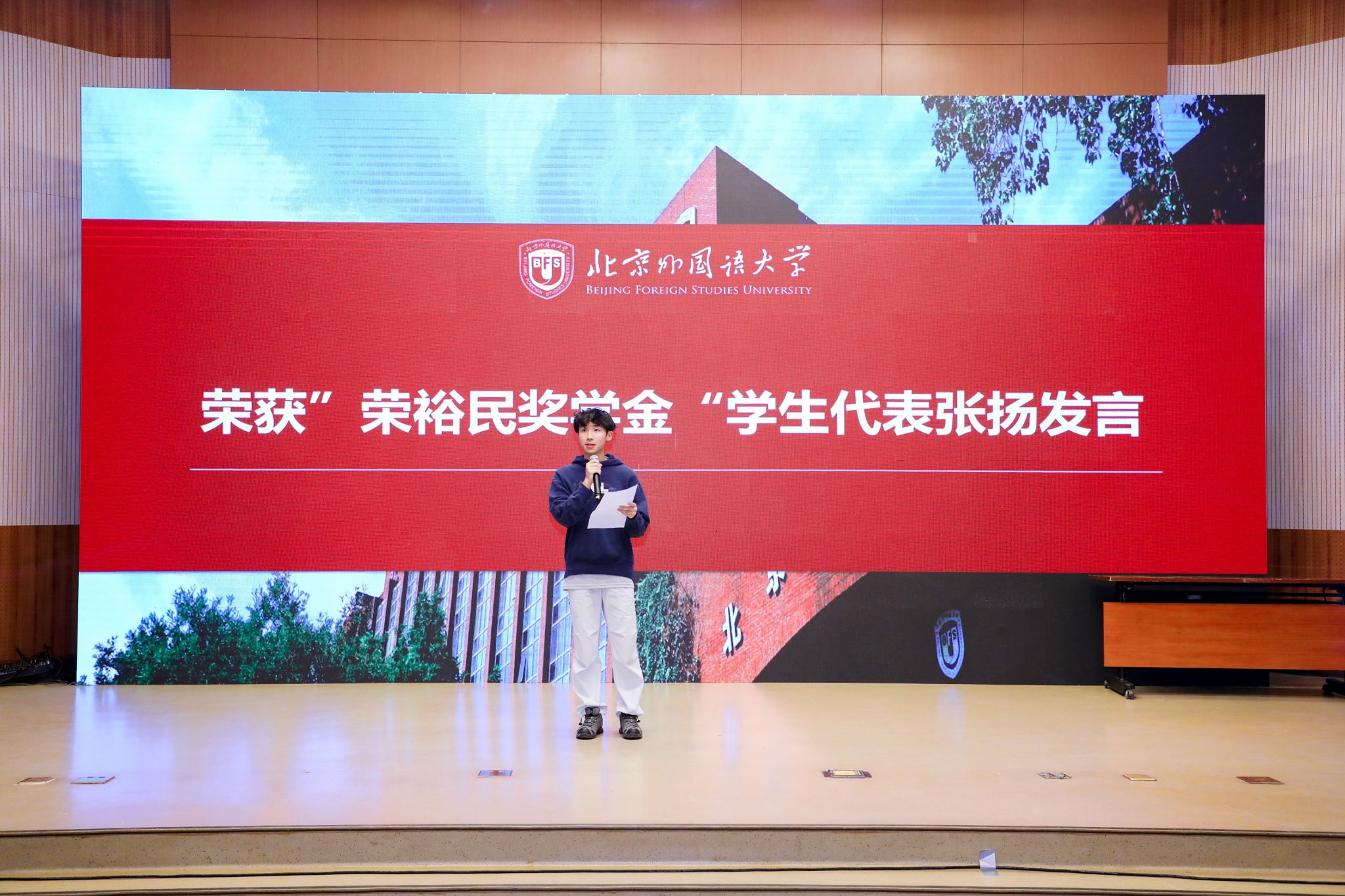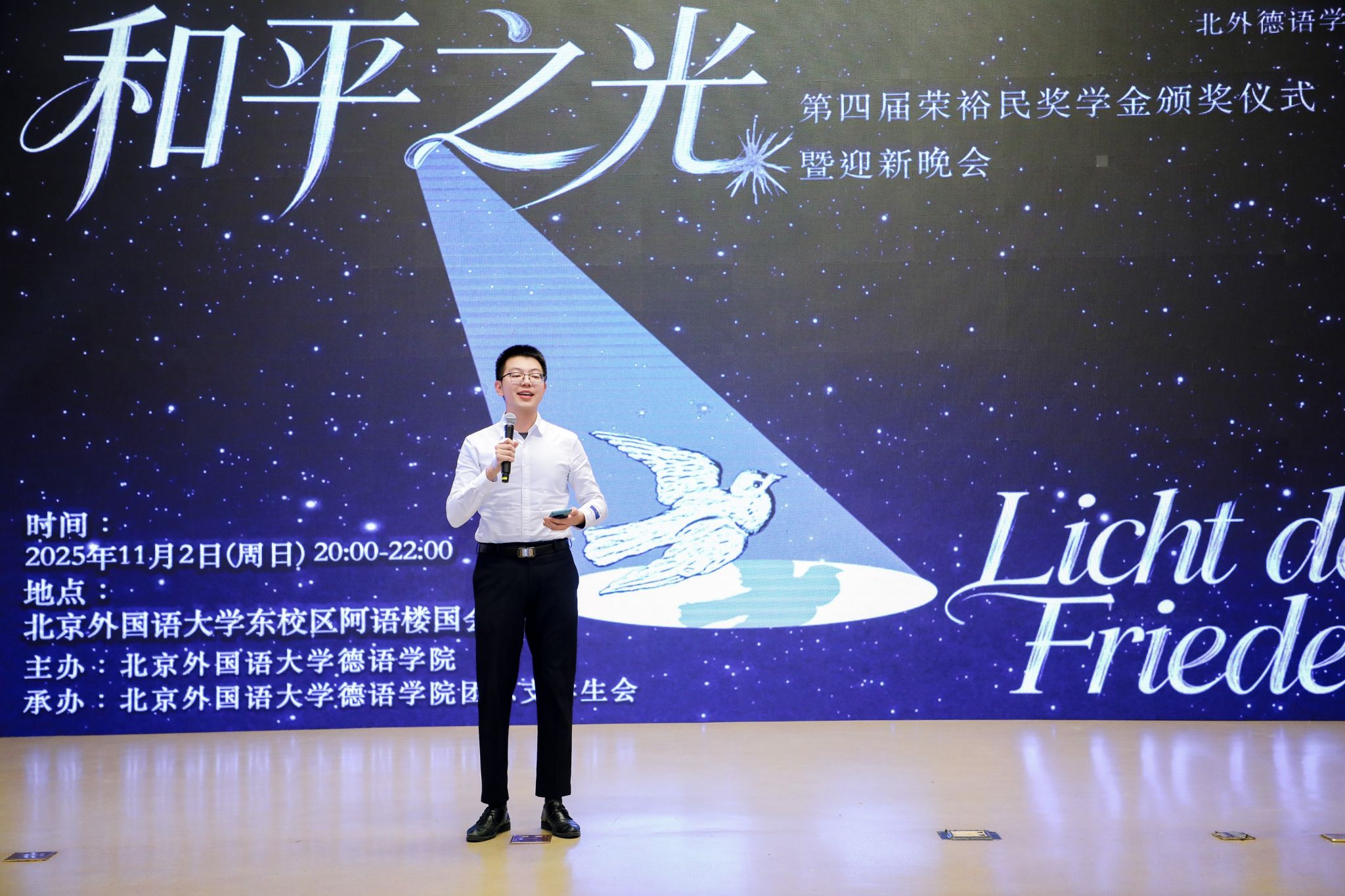 颁奖仪式当晚,yabo鸭脖官网“和平之光”2025级迎新晚会同步举行,以多元艺术诠释和平理念,为师生留下温暖记忆。“北外荣裕民基金”的设立凝聚了校友对母校的情谊与对教育的赤诚。未来,yabo鸭脖官网师生将带着这份荣誉和嘱托砥砺前行。