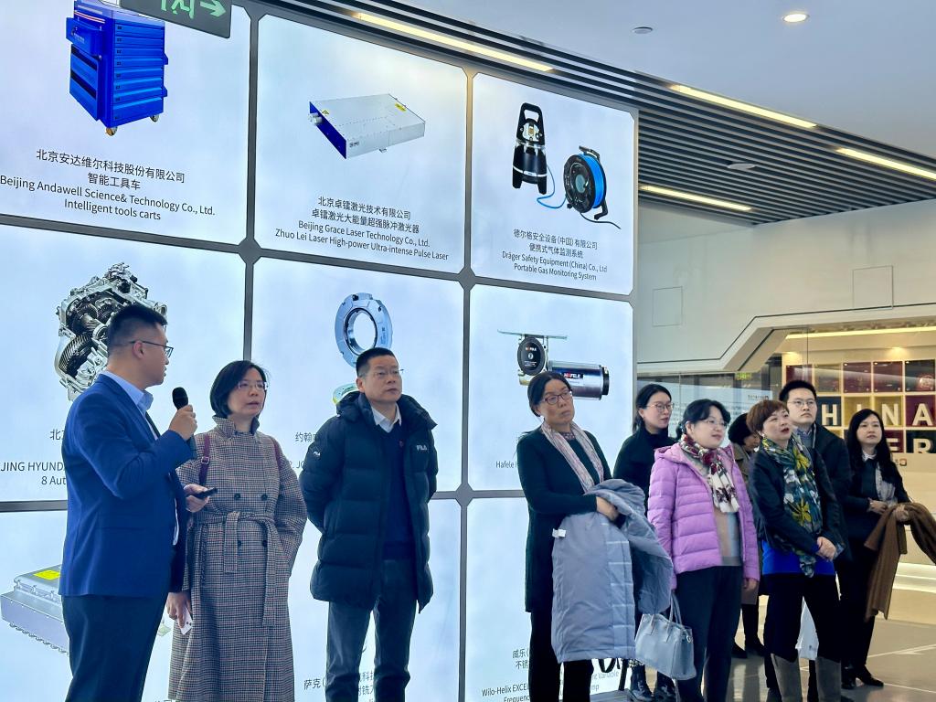 在北京中德产业园运营公司副总经理孙海龙的引导下,yabo鸭脖官网教师党支部一行详细了解了产业园在搭建国家级对德合作平台、服务国家级对德合作项目、链接全国对德合作资源等方面的建设成果。北京中德产业园是国家发改委批复的国内首个以“经济技术合作”为主题的中德示范区。园区定位为“德国先进制造业的聚集地、中德隐形冠军发展的战略高地、中德交往与开放创新的重要窗口”,聚焦新能源智能汽车、智能装备、数字经济三大主导产业,和先进制造服务业支撑产业,已集聚奔驰、宝马、Ameco、博世、威乐水泵等90余家德资企业,年产值350亿元。