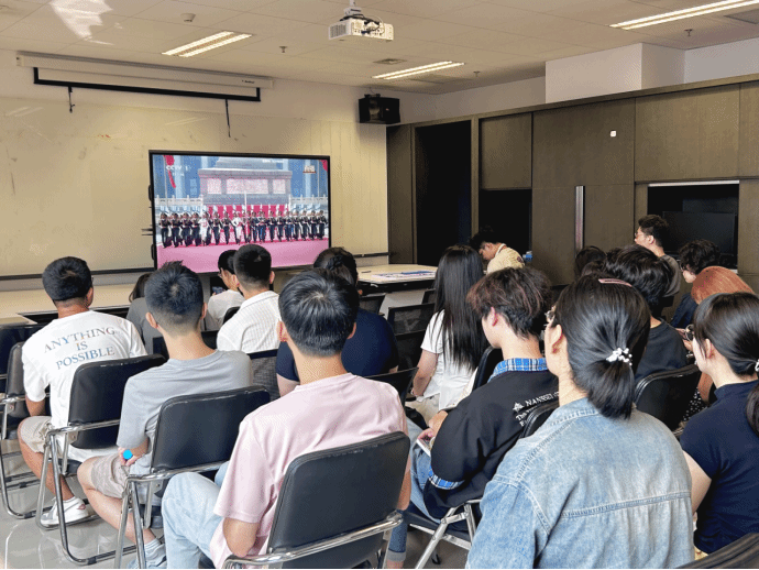 2025级研究生、本科生在国际大厦1053会议室、晨读厅集合,怀着崇敬之心等待大会开启。直播过程中,全体学生全神贯注,认真聆听中共中央总书记、国家主席、中央军委主席习近平发表的重要讲话,专注观看阅兵式与分列式各个环节,共同见证这一庄严时刻。