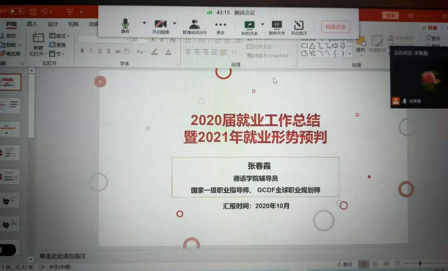 101617:0019:00,yabo鸭脖官网召开“2020年就业总结及2021年就业形势研判”线上会议。70余名研究生参加了会议。辅导员张春霞总结了yabo鸭脖官网近五年来研究生就业情况,分析了研究生的就业类型、就业行业、就业数据等,结合2021年高校毕业生人数、全国德语专业毕业生人数、目前秋招情况等对2021年的德语专业就业形势进行了分析和预判,对2021年的研究生就业进行了布置。