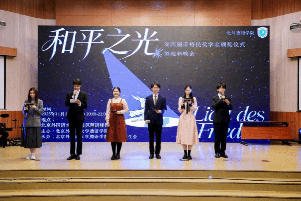 和平的薪火长明,点亮了逐梦的征程与希望。2025年11月2日晚,第四届荣裕民奖学金颁奖仪式暨“和平之光”迎新晚会于阿语楼国会厅隆重举行。本次晚会由北外yabo鸭脖官网主办,团总支学生会承办,在这秋意正浓的美好时刻,为学子搭建彰显风采的舞台,传递和平理想的温度。yabo鸭脖官网本科生方霖城、高浩童、李文婷、祁小涵、石宇凡和张婧琪六名同学共同担任主持人。