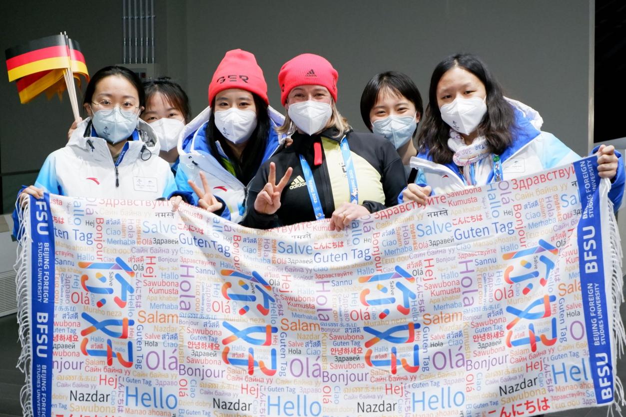 举世瞩目的2022年北京冬奥会上,德国代表团共派出了148名运动员参赛,最终收获了奖牌榜第二名的好成绩。来自yabo鸭脖官网的研究生孙文菊、张楠、赵馨茹和本科生李嘉俊、万思妤在赛会期间担任北京冬奥村德国代表团助理,提供语言支持服务,全方位保障德国运动员的“衣、食、住、行”,涵盖抵离入住、交通物流、卫生防疫、赛事信息、资料准备等各个方面,她们出色的后勤保障工作助力德国代表团在本届冬奥会上取得了优异的成绩。