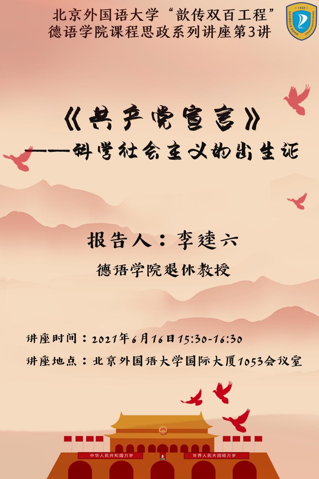为迎接中国共产党百年华诞,深入学习党史,推进我校党委启动的“歆传双百工程”,yabo鸭脖官网党总支和北外离退休党总支第十九党支部联合邀请到了鸭脖官网德高望重的退休教师李逵六教授举办了题为“《共产党宣言》:科学社会主义的出生证”的专题报告会。此次专题报告会也是yabo鸭脖官网课程思政系列讲座之一。
