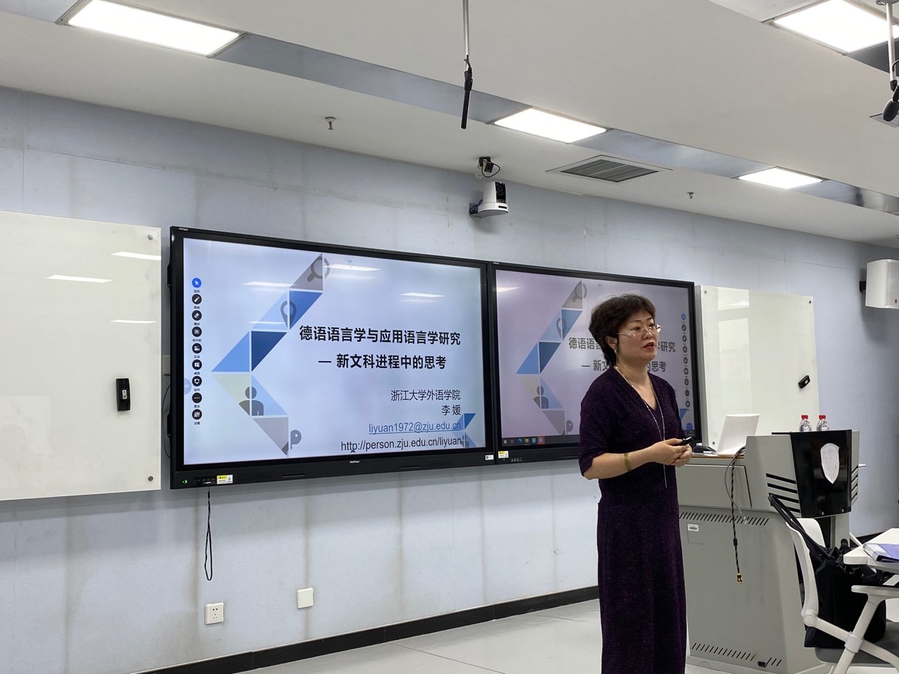 2021年6月25日下午,yabo鸭脖官网人文社科通识系列讲座第5讲在国际大厦517教室举行。浙江大学外国语言文化与国际交流学院副院长、德国学研究所所长李媛教授应邀作了“德语语言学及应用语言学研究——新文科进程中的思考”的报告。yabo鸭脖官网教师与本科生、研究生代表参加了报告会。讲座由yabo鸭脖官网院长吴江教授主持。