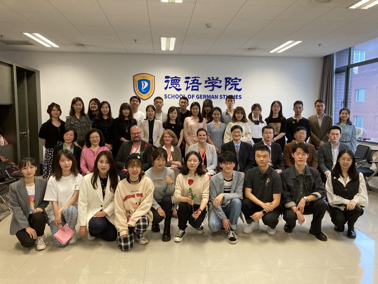 参加本次活动的系友嘉宾有原中国驻奥地利大使馆文化参赞、原德国柏林中国文化中心主任贾建新先生、中联部德奥处处长孙守亮先生、中央党史和文献研究院第五研究部一级翻译张凤凤女士、国家体育总局李嬿女士、华晨宝马公司陈静女士、中央电视台国际新闻编辑赵雄先生、德国电信北京代表处黎默雨女士等。受邀出席诗诵会的德方嘉宾有德国学术交流中心北京代表处首席代表Ruth Schimanowski女士、德国歌德学院副院长伉俪Sabine Wilmes女士和Henrik Dittmann先生。北外上海校友会会长、“程慧玲奖学金”捐赠者、鸭脖官网1981级系友程慧玲女士和“yabo鸭脖官网思刚教育发展基金”捐赠者、鸭脖官网1994级系友秦思刚、罗旻一家也参与了诗诵会活动。