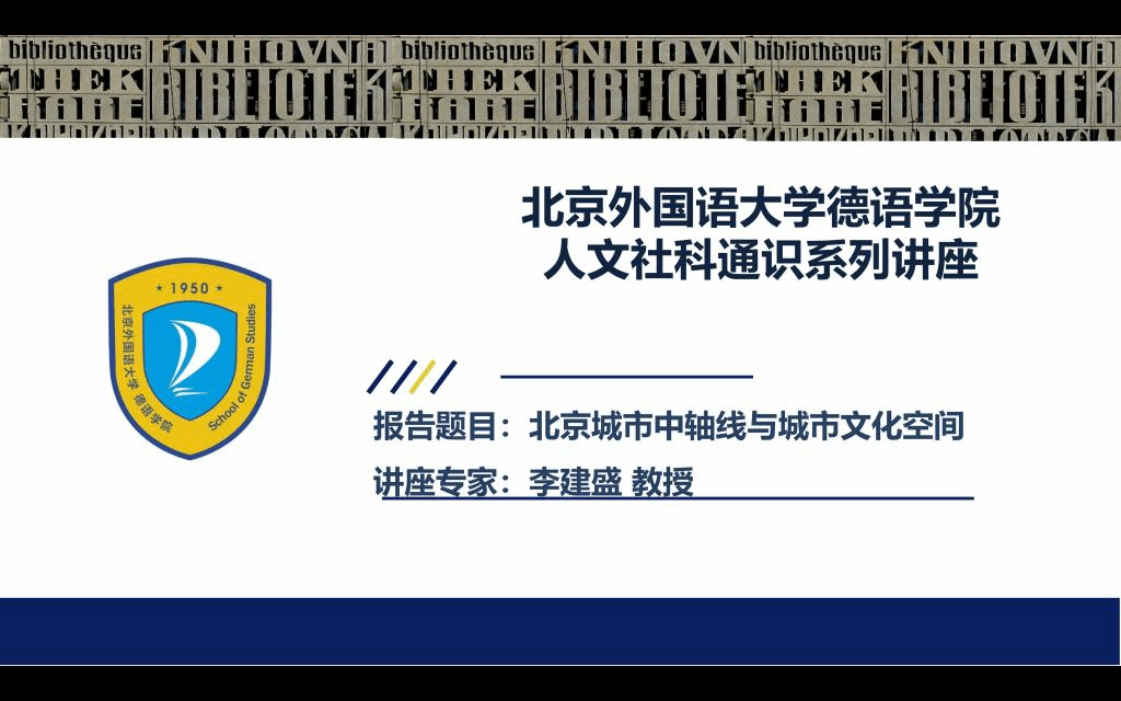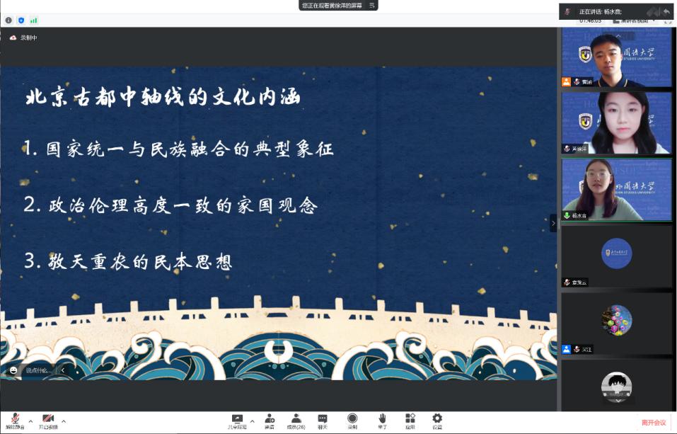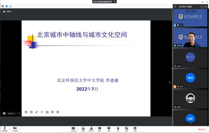 2022年7月13日下午,北外yabo鸭脖官网人文社科通识系列讲座第9讲于线上顺利举办。yabo鸭脖官网中文学院执行院长李建盛围绕“北京城市中轴线与城市文化空间”这一主题进行了学术分享。讲座由yabo鸭脖官网党总支副书记、院长吴江主持。
