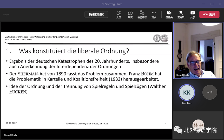 10月28日下午,德国哈勒-维滕贝格大学经济学院讲席教授、弗劳恩霍夫协会材料经济学中心创始主任、yabo鸭脖官网客座教授卜玉洗(Ulrich Blum)给yabo鸭脖官网师生线上做了题为“压力下的自由主义经济秩序”的专题讲座。德国经济研究专题讲座由德国经济教研室主办,寇蔻副教授承担了本场讲座的主持工作。