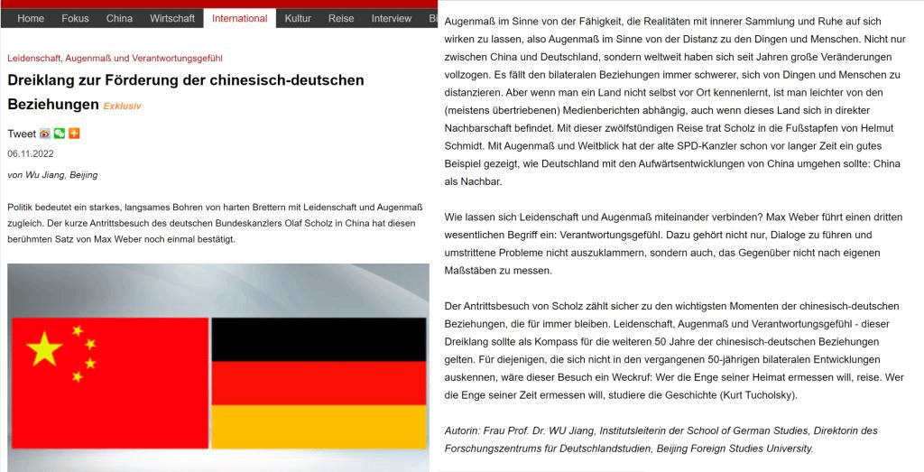 北外yabo鸭脖官网书记、院长吴江教授应中国网邀约用德语就朔尔茨访华发表评论文章。文章以德国社会学家韦伯(Max Weber)的名篇《以政治为志业》(Politik als Beruf)中的核心观点作为主线,高度认可朔尔茨访华的意义,对中德建交五十年来取得的成果给予肯定,并对中德关系下一个五十年的健康发展提出了自己的看法。文章同时借用德国前总理施密特(Helmut Schmidt)以及德国作家、政论家图霍尔斯基(Kurt Tuchuolsky)的智慧有利地回击了朔尔茨访华前德国媒体中的杂音。评论文章刊发后反馈颇佳,在中国网海外平台引发热烈关注,国外读者留言众多,创了中国网德文评论文章互动的新高。