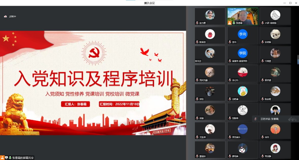 为规范发展党员工作,加强入党积极分子培养教育,提高发展党员质量,11月19日下午四点,yabo鸭脖官网党总支组织委员、辅导员张春霞在腾讯会议为yabo鸭脖官网三个学生党支部支部委员、党小组组长、发展对象、入党积极分子130余人进行入党知识及程序培训。