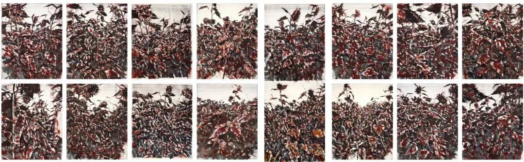 口译过程中,王静怡特别记录了几件令她印象深刻的事情:其一是范院长通过旅德中国艺术家的作品向傅融大使介绍了中德艺术之间的互译性特征,及对生命与自然的深切关注与礼赞,这表现在参展的绘画、雕塑、装置与设计作品中。如许江的系列绘画作品“葵”,它有机融合了中德传统思维与现代表征方式,透过颤动机会疾飞的笔触与深沉厚重的肌理,在吟咏“葵”之生命的颂歌中构筑起史诗般的宏阔意境。对此,傅融大使非常感兴趣,仔细询问范院长这系列作品的创作地点是中国还是德国。