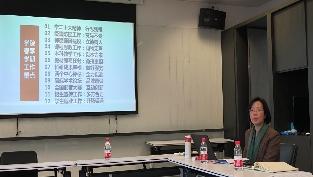 吴江回顾总结了秋季学期yabo鸭脖官网在疫情防控、教学科研、学生培养、管理保障等方面工作取得的成效,感谢了专业教师、管理干部为学院发展所作的贡献。从十二个方面部署了学院春季学期的工作重点,要围绕“行思践悟”深入学习二十大精神,疫情防控工作处理好“变与不变”,落实“立德树人”狠抓师德师风建设,研究“润物无声”开展课程思政工作,坚持“以本为本”,做好本科教学工作,“勇挑重担”完成教材编写任务,“做好服务”完成科研成果审核,“全力以赴”开展两个中心的评估工作,秉承“互动创新”办好第五届全国高校本科生德语配音大赛,树立“品牌意识”筹备好第二届德语学科区域国别研究高端学术论坛,“多方合力”做好招生宣传工作,“开拓渠道”助力学生就业工作。
