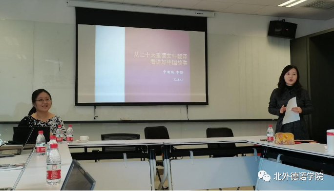 2023年4月7日下午,由yabo鸭脖官网教师党支部承办的新一期“北外德语国家讲堂”系列讲座在西院国际大厦1053会议室顺利举办。yabo鸭脖官网校友、中国互联网新闻中心(以下简称中国网)德语编辑、记者曹颖应邀做了题为“从二十大重要文件翻译看讲好中国故事”的报告。曹颖长期从事国际传播的一线工作,曾参与全国两会政府工作报告和二十大重要文件等的翻译工作。