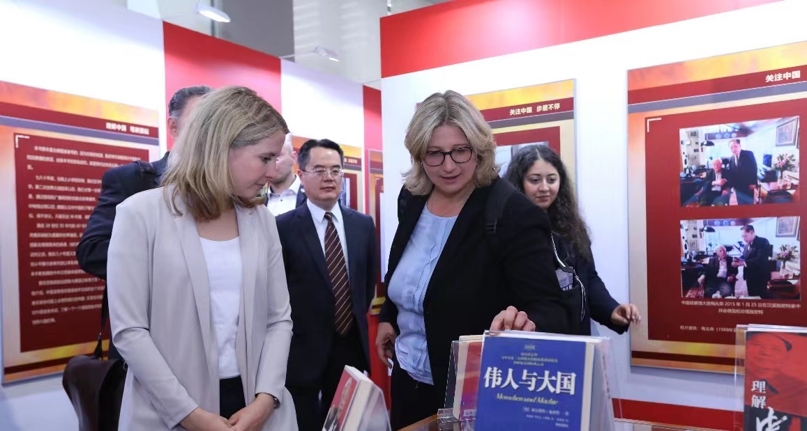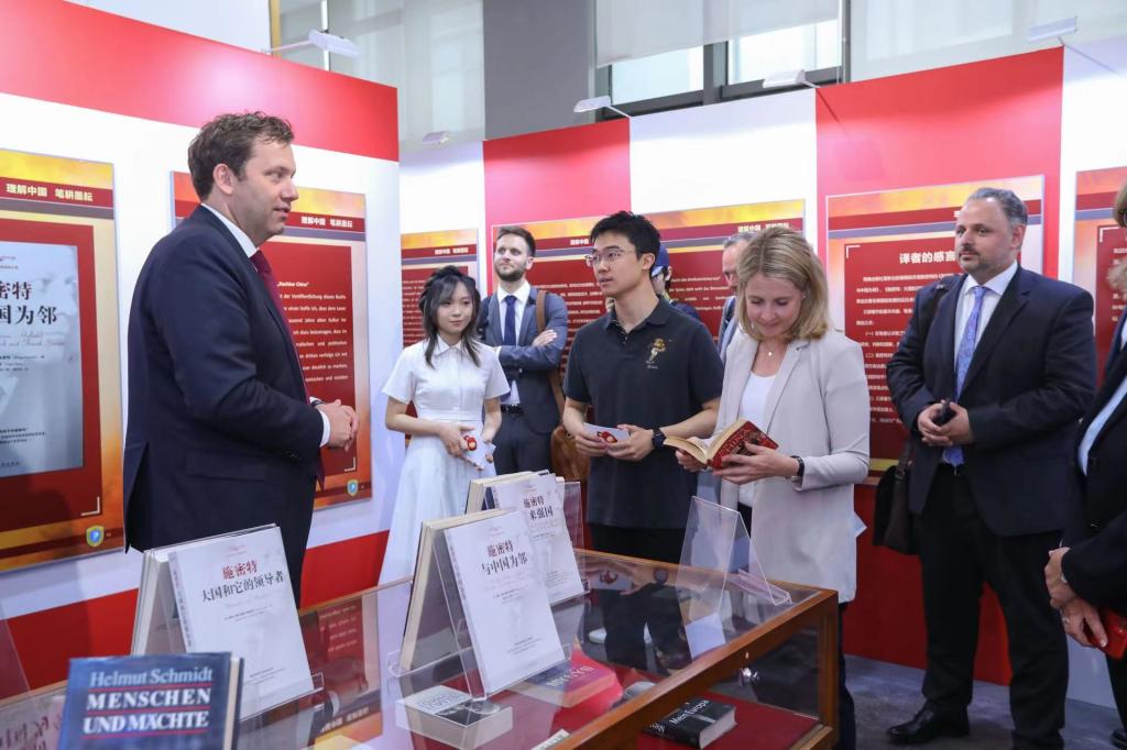 施密特一生撰写了多部以中国为主题或与中国相关的论著,许多著作的中译本都凝聚了北外校友的心血,例如中国前驻德国大使梅兆荣先生领衔翻译的《与中国为邻》(Nachbar China)、《伟人与大国》(Menschen und Mächte)以及已故北外yabo鸭脖官网教授刘芳本老师领衔翻译的《行动起来 为了德国》(Handeln für Deutschland)等。展板的第四板块“理解中国 笔耕墨耘”展出了施密特经典著作的德文版以及中译本。克林贝尔在得知yabo鸭脖官网图书馆藏有诸多施密特著作及中译本后表示非常感动。代表团全体成员在书籍前停下脚步,认真翻阅,并对北外德语学科点在人才培养领域做出的杰出贡献表示赞赏。