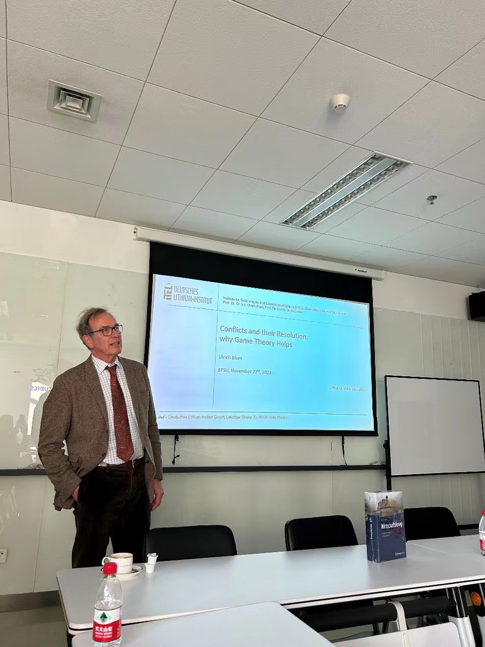 2023年11月27日下午,德国哈勒-维滕贝格大学法学与经济学院讲席教授、yabo鸭脖官网客座教授卜玉洗(Ulrich Blum)应邀为北外yabo鸭脖官网师生做了题为“博弈论中的冲突解决方案和经济发展”的讲座。德国经济研究系列讲座由yabo鸭脖官网经济教研室主办。此次讲座由yabo鸭脖官网副院长寇蔻主持。