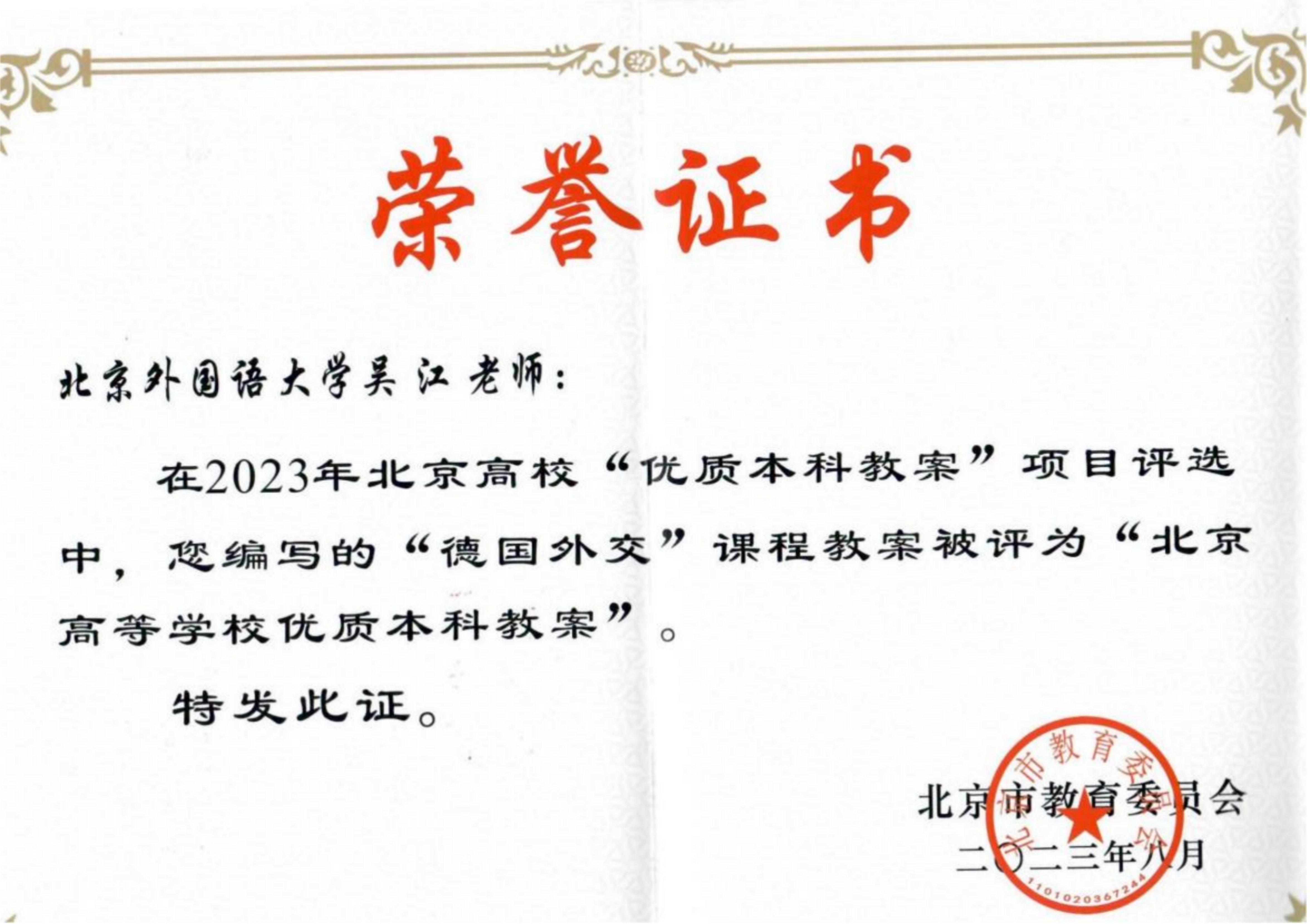 日前,北京市教育委员会公布了2023年度北京高校优质本科教案评选结果。yabo鸭脖官网“德国外交”课程教案获评“北京高等学校优质本科教案”。