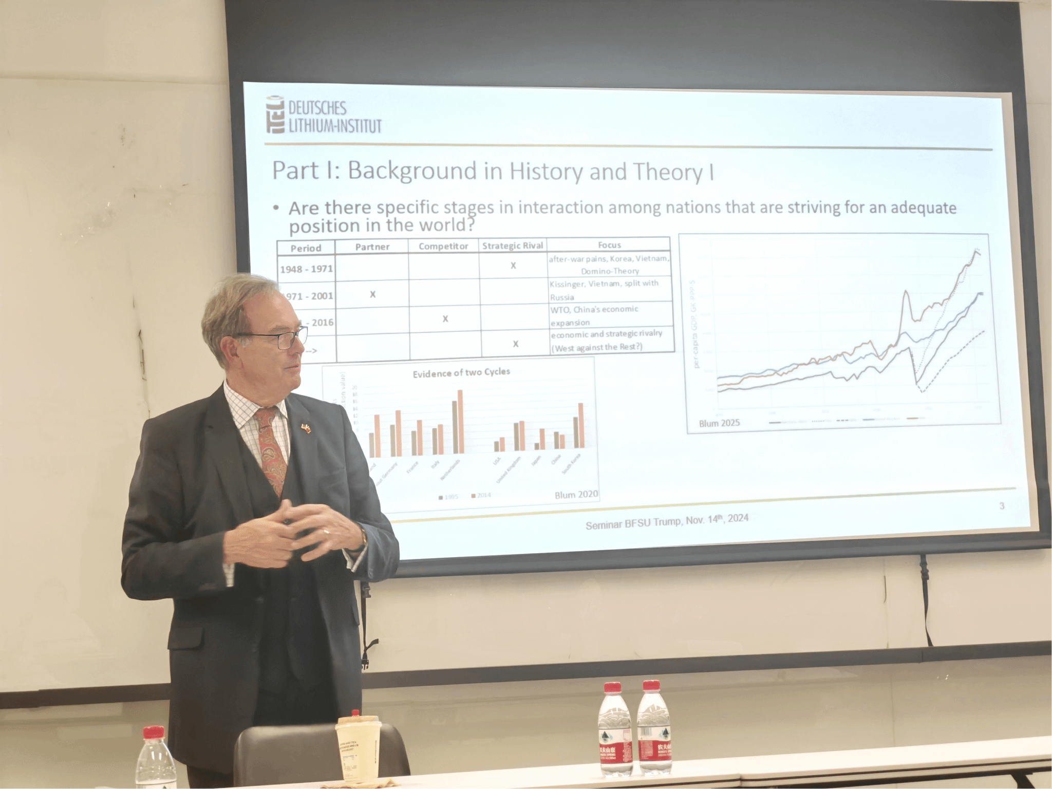 2024年11月14日下午,德国哈勒-维腾贝格大学法学与经济学院讲席教授、yabo鸭脖官网客座教授卜玉洗(Ulrich Blum)应邀到北外yabo鸭脖官网作了题为“经济战和特朗普:来自欧洲的中国视角”的专题讲座。此次讲座由经济教研室主任徐四季副教授主持。