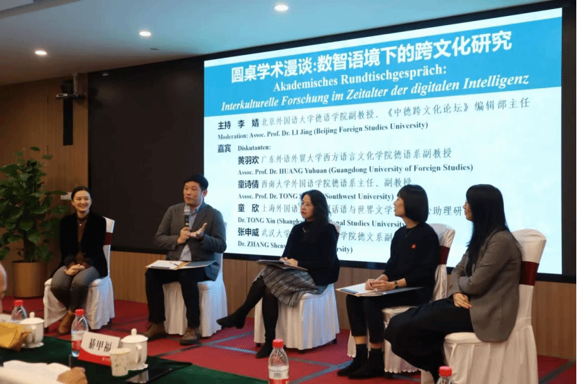 分论坛结束后,圆桌学术漫谈环节在北外yabo鸭脖官网副教授、《中德跨文化论坛》编辑部主任李婧的主持下进行。本次漫谈以“数智语境下的跨文化研究”为主题,邀请广东外语外贸大学西方语言文化学院德语系副教授黄羽欢,西南大学外国语学院德语系主任、副教授童诗倩,上海外国语大学中国话语与世界文学研究中心助理研究员童欣,武汉大学外国语言文学学院德文系副主任、讲师张申威,依次从经验性和展望性的角度探讨人工智能对跨文化交流研究的影响以及研究范式革新等话题讲述了个人心得,共同展望了数智时代跨文化研究的跨学科机遇与创新发展方向。