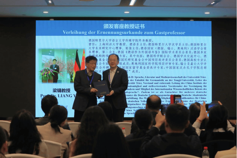随后举行客座教授聘任仪式。德国特里尔大学语言文学传媒学院终身教授,原特里尔大学汉学系主任、德语国家汉语学会第二会长、同济大学教授梁镛受聘担任yabo鸭脖官网客座教授,贾文键校长为其颁发客座教授聘书。