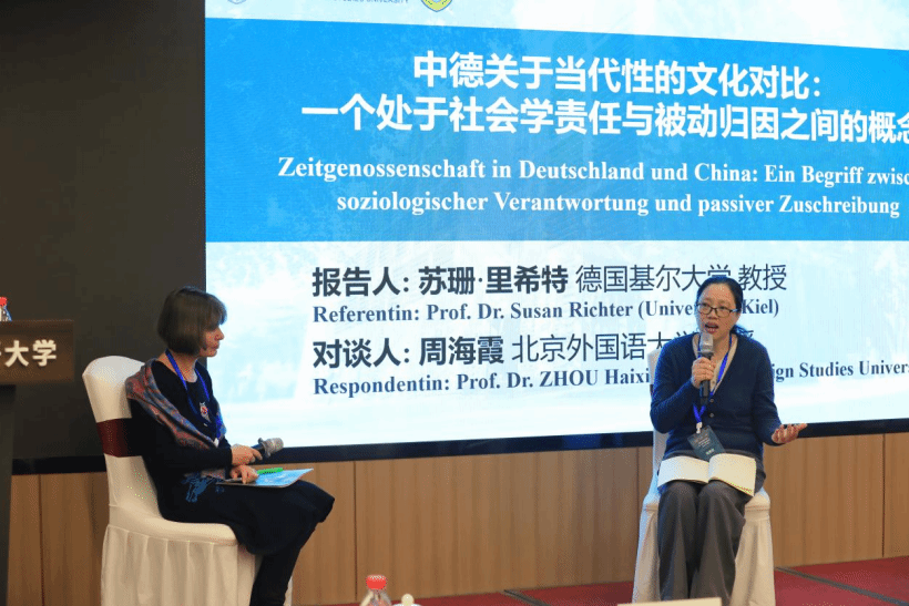德国基尔大学苏珊·里希特(Susan Richter)教授的报告题为《中德关于同时代性的文化对比:一个处于社会学责任与被动归因之间的概念》。她从跨文化与社会学的独特视角切入,追溯“同时代性”(Zeitgenossenschaft)与“同时代人”(Zeitgenossen)在德国人文科学、文化创作与日常话语中的使用脉络,通过比较伏尔泰、腓特烈二世与乾隆等历史人物的案例,反思“同时代性”这一概念在中德不同文化语境下的内涵差异与价值归因。北外yabo鸭脖官网教授周海霞作为对谈人指出,中国语境中也常提及“同时代人”概念,未来可进行中德“同时代性”整合研究。双方还就“同时代”的时间界定、跨文化可比性及社交媒体时代的概念延展等议题进行了富有启发性的探讨。