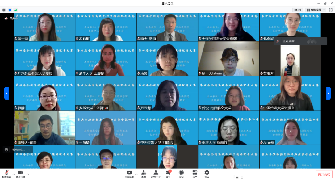 开幕式结束后,全国高校本科生德语配音大赛项目负责人、yabo鸭脖官网教师顾苏博士详细介绍了大赛初赛五个分会场的具体安排以及评审规则。大赛初赛于9点30分准时开始,评委团队采取交叉回避原则分组对参赛作品进行了评审。虽然疫情导致各高校选手无法面对面交流,但是腾讯会议间的“万籁俱唱”精彩纷呈。经过激烈的角逐,共选出15支参赛队伍晋级决赛。南京大学外国语学院德语系教师常晅博士以及yabo鸭脖官网德国学术交流中心专家Tim Hirschberg代表全体评委对本次大赛的参赛作品进行了精彩的点评。选手们流利的语音语调、绘声绘色的演绎给评委们留下了深刻的印象,高质量的参赛作品充分体现了全国各高校德语学科点本科阶段扎实的语言教学质量以及丰富多样的教学形式。