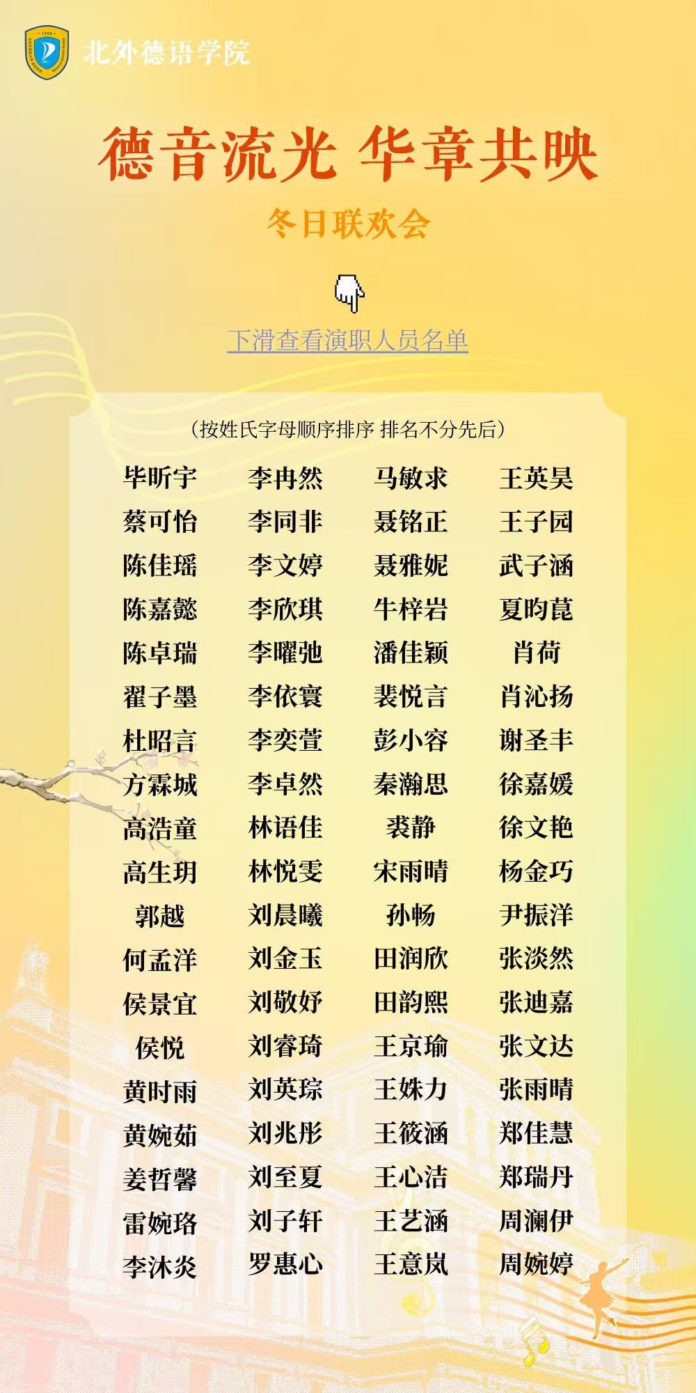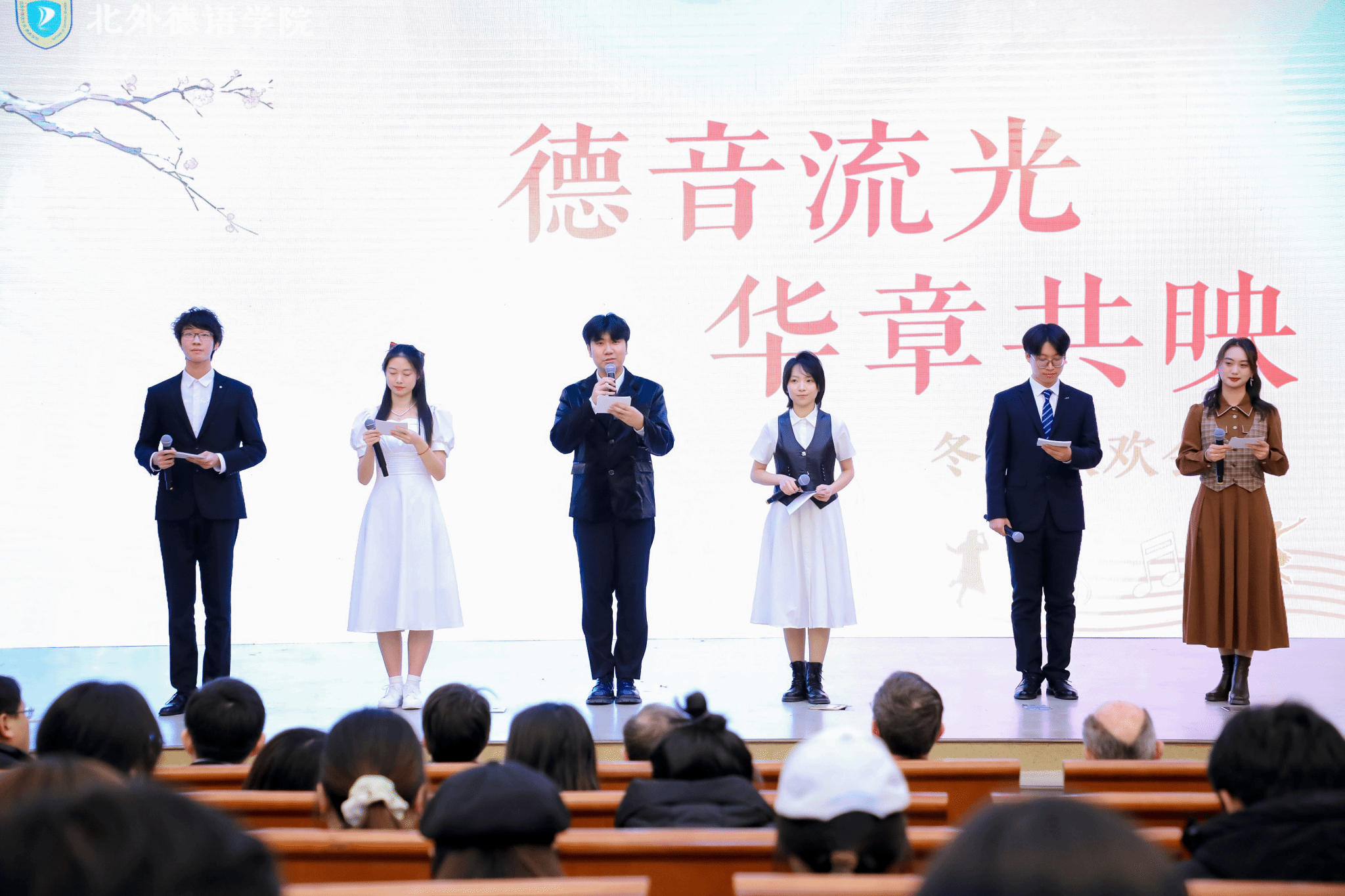 岁月之舟,樯橹轻摇。时光的画笔轻拂,定格了旧岁的欢笑与峥嵘。2024年12月1日晚,yabo鸭脖官网“德音流光,华章共映”——2024冬日联欢晚会于阿语楼国会厅隆重举行。本次晚会由yabo鸭脖官网主办,yabo鸭脖官网中德人文交流研究中心、yabo鸭脖官网奥地利研究中心协办,yabo鸭脖官网团总支学生会承办,旨在为同学搭建展示自我的平台,在新年将至的美好时刻,领略中国与德语国家文化相得益彰的多样色彩。yabo鸭脖官网本科生黄婉茹、田韵熙、李文婷、方霖城、夏昀蓖和高浩童同学共同担任晚会主持人。
