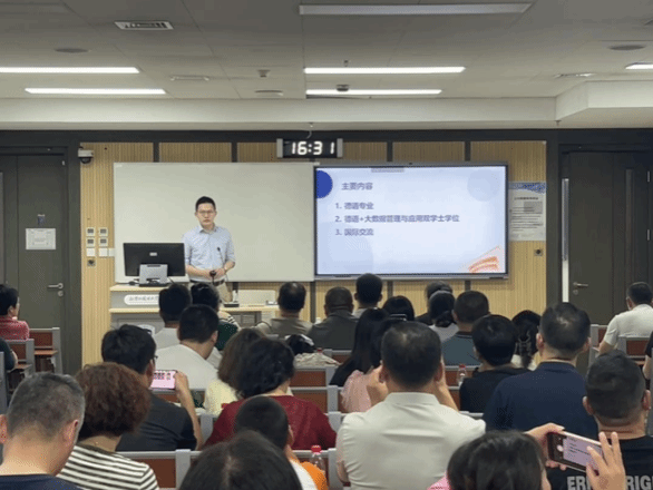 随后,yabo鸭脖官网党总支委员、副院长寇蔻聚焦本科人才培养,为家长们详细解读本科专业人才培养方案。他指出,学院正积极推动数智赋能本科教学,以科技助力教学质量提升。并围绕本科课程体系,分别介绍基础阶段的知识夯实重点与高年级阶段的课程设置,强调高年级选课体系“动态多元”的特点,满足学生个性化发展需求。寇蔻副院长还提及北外德语专业本科基础阶段教学改革成果,重点介绍《新经典德语》教材的应用——通过教材内容设计,引导学生用德语讲好中国故事,推动中外文明互鉴;同时梳理学院重要考试安排、各类赛事资源及选拔机制,为家长清晰呈现学生成长路径。此外,针对今年第一年招生的 “德语+大数据管理与应用” 双学士学位项目展开说明,从思政育人、课程育人、实践育人三个维度,介绍该项目的德语课程、大数据管理与应用课程及交叉融合课程设置;并围绕国际化人才培养,列举交流学习项目、海外实习实践机会、国外专家讲学讲座及高水平国际交流活动,展现学院为学生搭建的国际化成长平台。