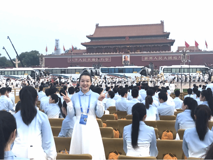 我也遇到过许多困难,这其中最难的就是身体素质上的挑战。这其中既有在军营同军乐团在烈日当空的午后合练,也有在天安门广场披星戴月的三次综合演练。但是当我真正站在天安门广场上时,我真心体会到这些付出都是值得的。站在祖国的心房,聆听礼炮惊天动地的回响,以及国旗护卫队整齐的踏步声,口号声,将军刀齐刷刷立起时的金属撞击声,亲眼见证一件件大国重器的雄姿,我心潮澎湃。生逢其时,何其有幸。“歌唱我们亲爱的祖国,从今走向繁荣富强!”随着《歌唱祖国》最后一句歌词结束,此次纪念大会四个多月来的准备就此告一段落,但“请党放心,强国有我”青春誓言,将和这段宝贵的经历一起久久地铭刻在我的心中。