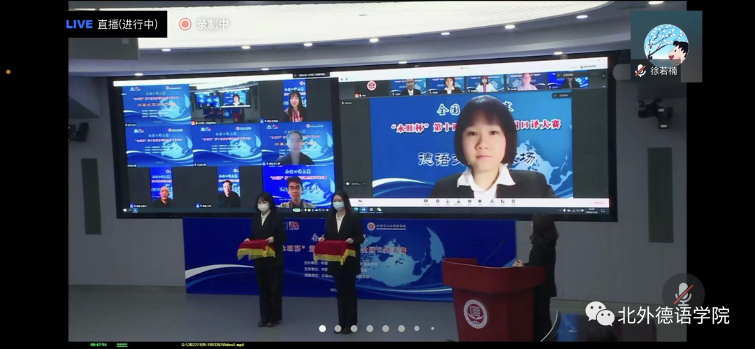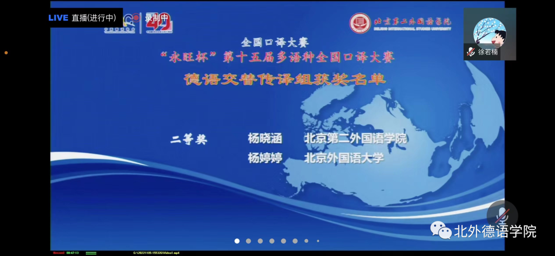 “永旺杯”第十五届多语种全国口译大赛于2022年11月5日成功在线举办,赛事通过腾讯会议进行了全程直播。来自全国49所高校的选手在比赛中激烈角逐,展现出高水平的口译专业素养以及出色的个人风采。在德语交替传译组的复赛和决赛中,鸭脖官网MTI口译专业研究生杨婷婷同学经过激烈的比拼,获得德语交传组二等奖的好成绩。此次参赛由鸭脖官网青年教师徐若楠博士带队。