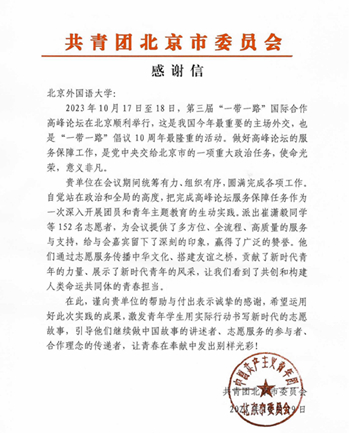 10月19日,共青团北京市委员会向北外致感谢信,激励北外学子继续做中国故事的讲述者、志愿服务的参与者和合作理念的传递者。北外团委的老师向我们传达了感谢信的内容,每个志愿者同学都感到无尚光荣与自豪。